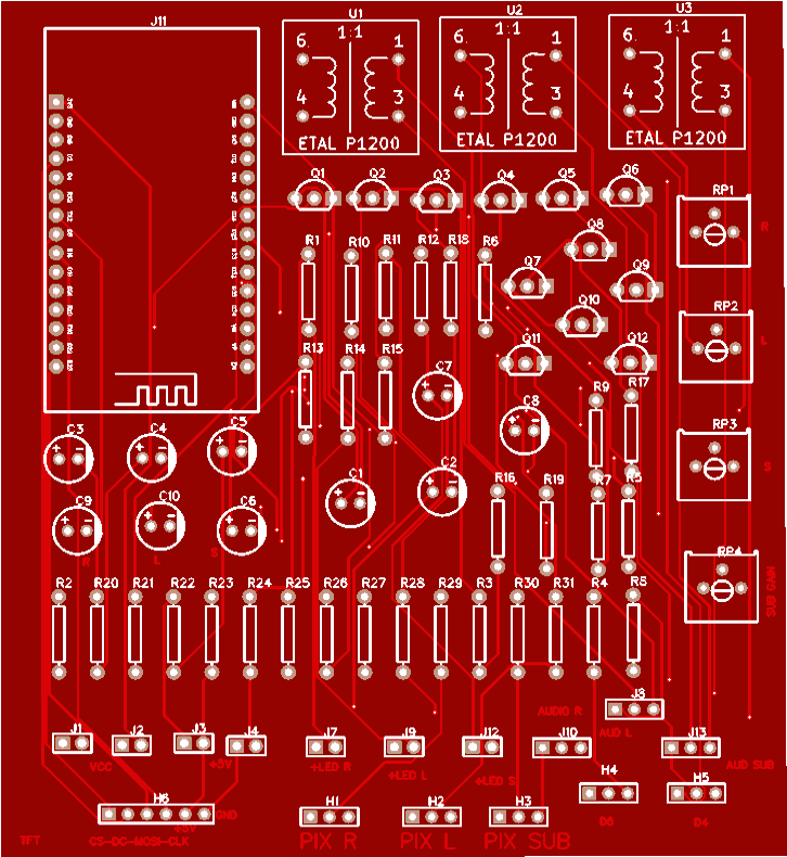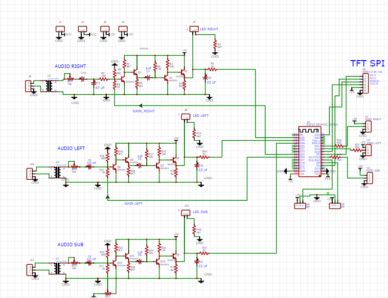 Despues de un analisis de practicas anteriores vemos que necesitamos para cada canal (3), de un potenciometro de control de entrada de audio y un potenciometro de control de ganancia, y como en este diseño no tenemos dac para el tercer canal sub, podriamos mandar en paralelo la señal de audio convertida en nivel de tensión al esp32 dedicado al tft, pero veo que se volveria a ralentiar el proceso