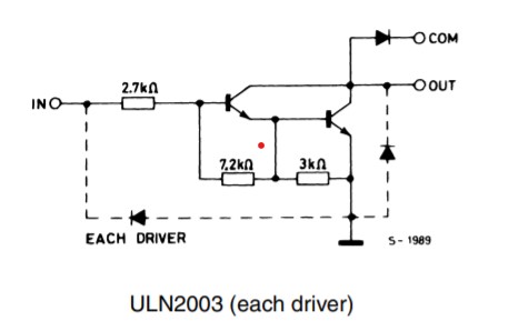 Tenemos que saber que este integrado consta de un array de siete par darlington como se muestra en el esquema, y necesita entradas de alto nivel para cambiar el estado a bajo nivel en su salida. Su uso ideado para alimentar las bobinas de motores paso a paso o simplemente un motor DC, hace que un extremo del bobinado se conecte directamente al polo positivo de la fuente o bateria y cierra el circuito a traves del elemento del array, (emisor -colector) conectado a gnd.